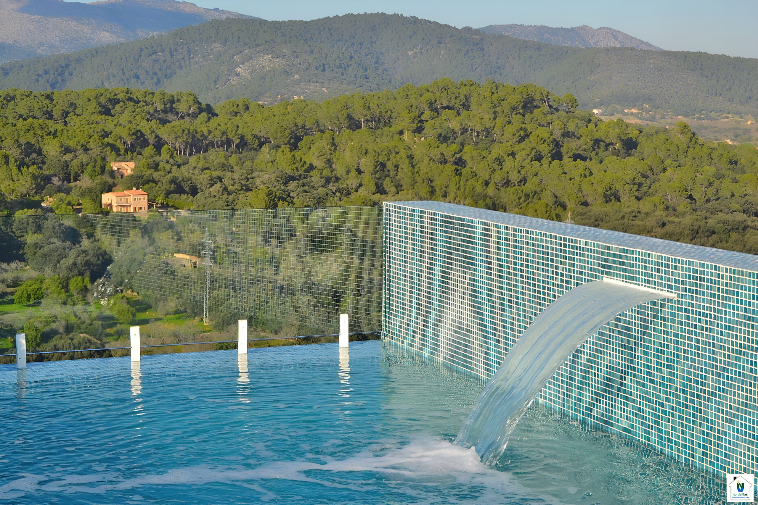 Der erfrischende Pool von Montblau bietet nicht nur wunderbare Aussichten von der Dachterrasse, sondern auch Privatsphäre und Ruhe. Eine schmale Glaswand an einer Seite des Pools verbindet sich mit dem geräumigen Innenbereich des Hauses und schafft einen wunderschönen Spiegeleffekt des bewegten Wassers.