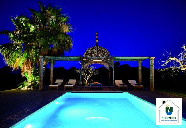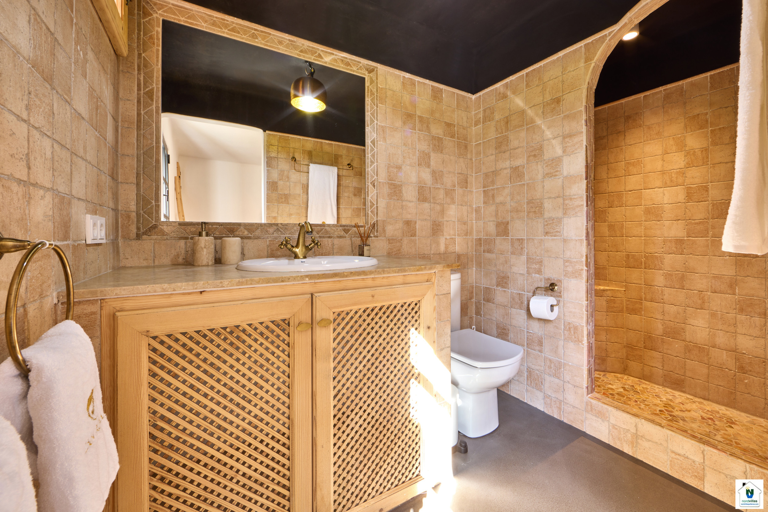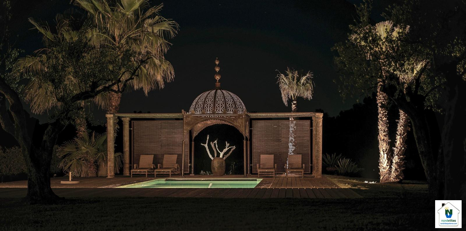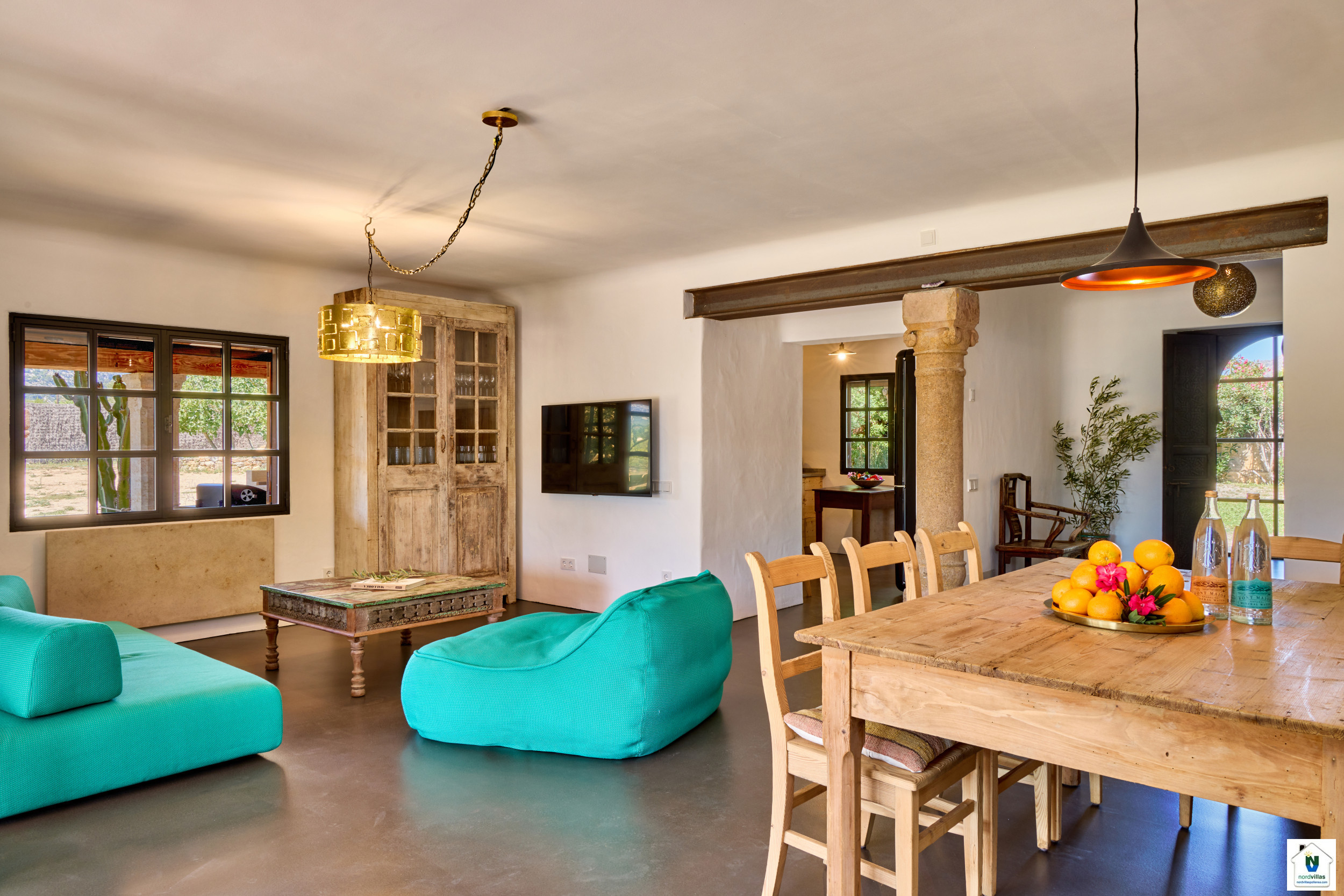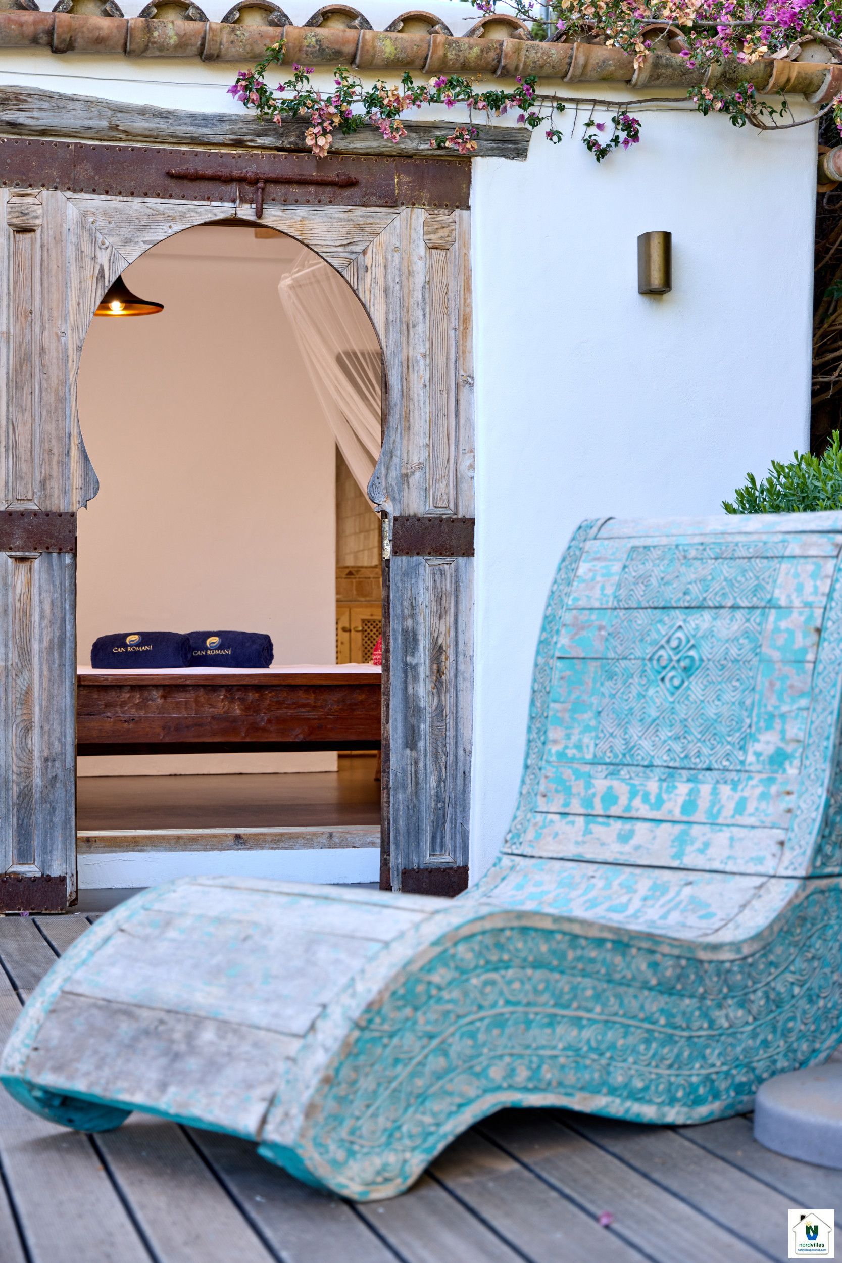 Im Freien dreht sich das Leben um den Salzwasserpool, umgeben von Sonnenliegen und einer Dusche zwischen Olivenbäumen, die die Frische des Bades verlängert. Lebendige Farben in Poufs und Sitzgelegenheiten mit Formen riesiger Blumen verstärken die orientalische und fröhliche Atmosphäre des Anwesens.