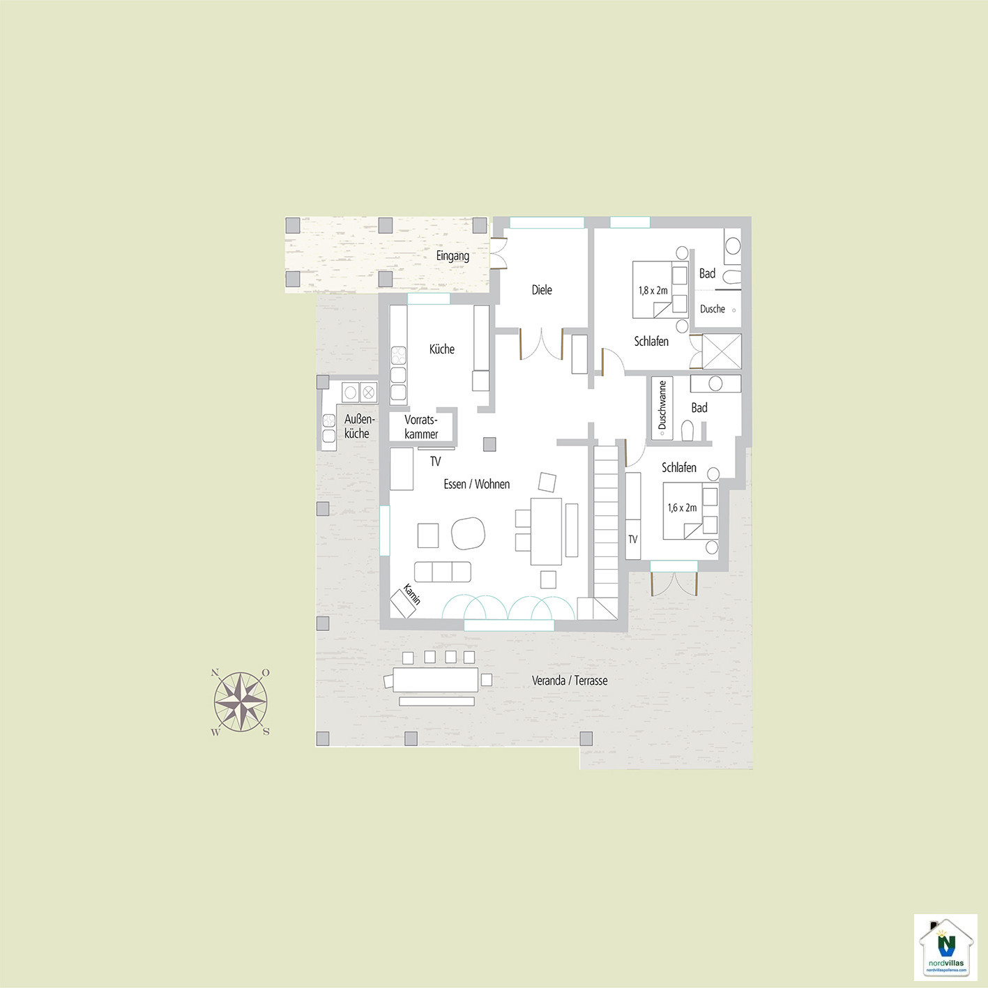 Die große Hauptterrasse (40 m², 25 m² überdacht) beherbergt eine Außenküche mit Gasherd, einen großen Esstisch und gemütliche Bereiche zum Teilen. Hier wird gekocht, gelebt und gefeiert und wird zum Mittelpunkt der mediterranen Erfahrung.