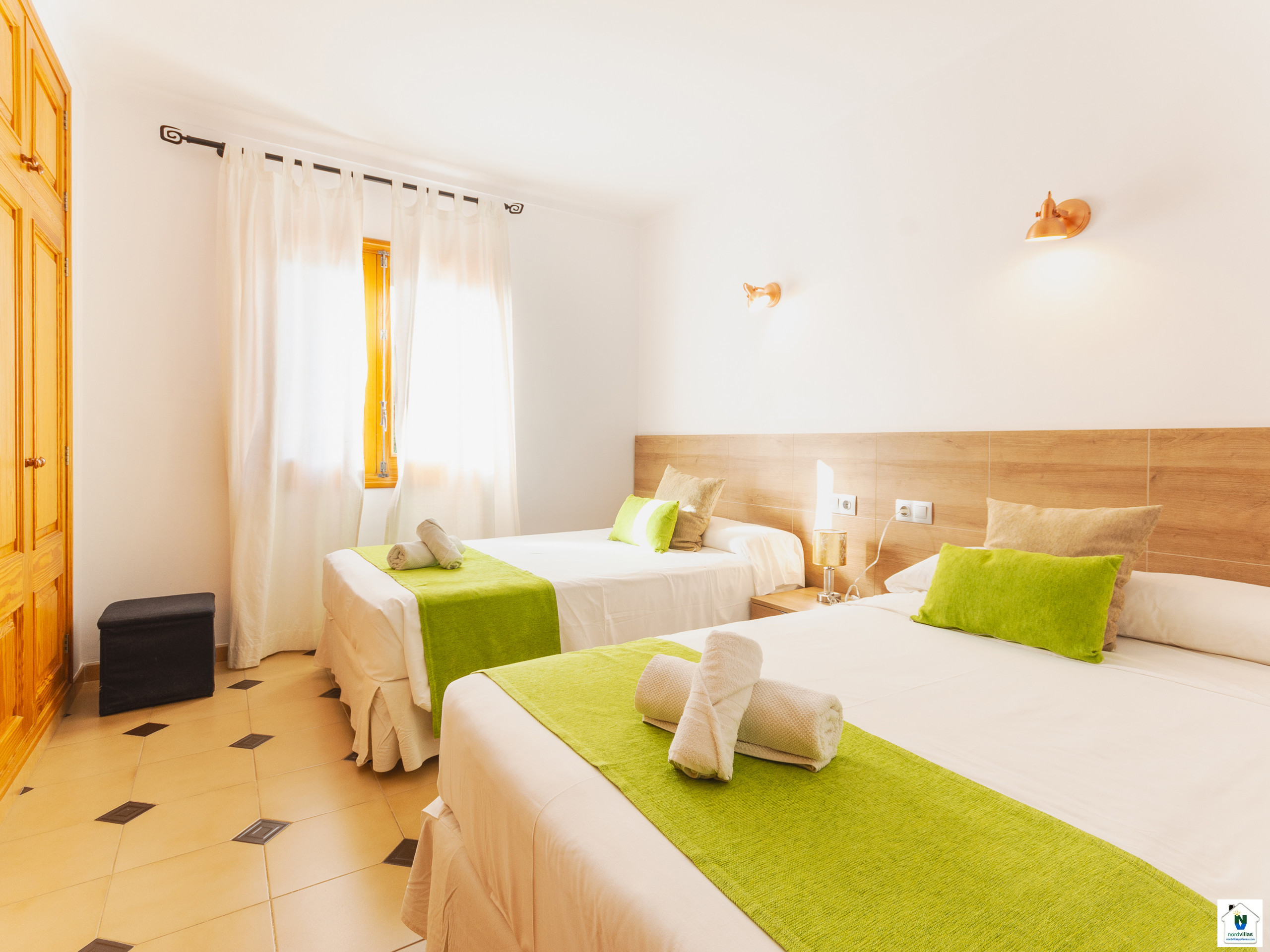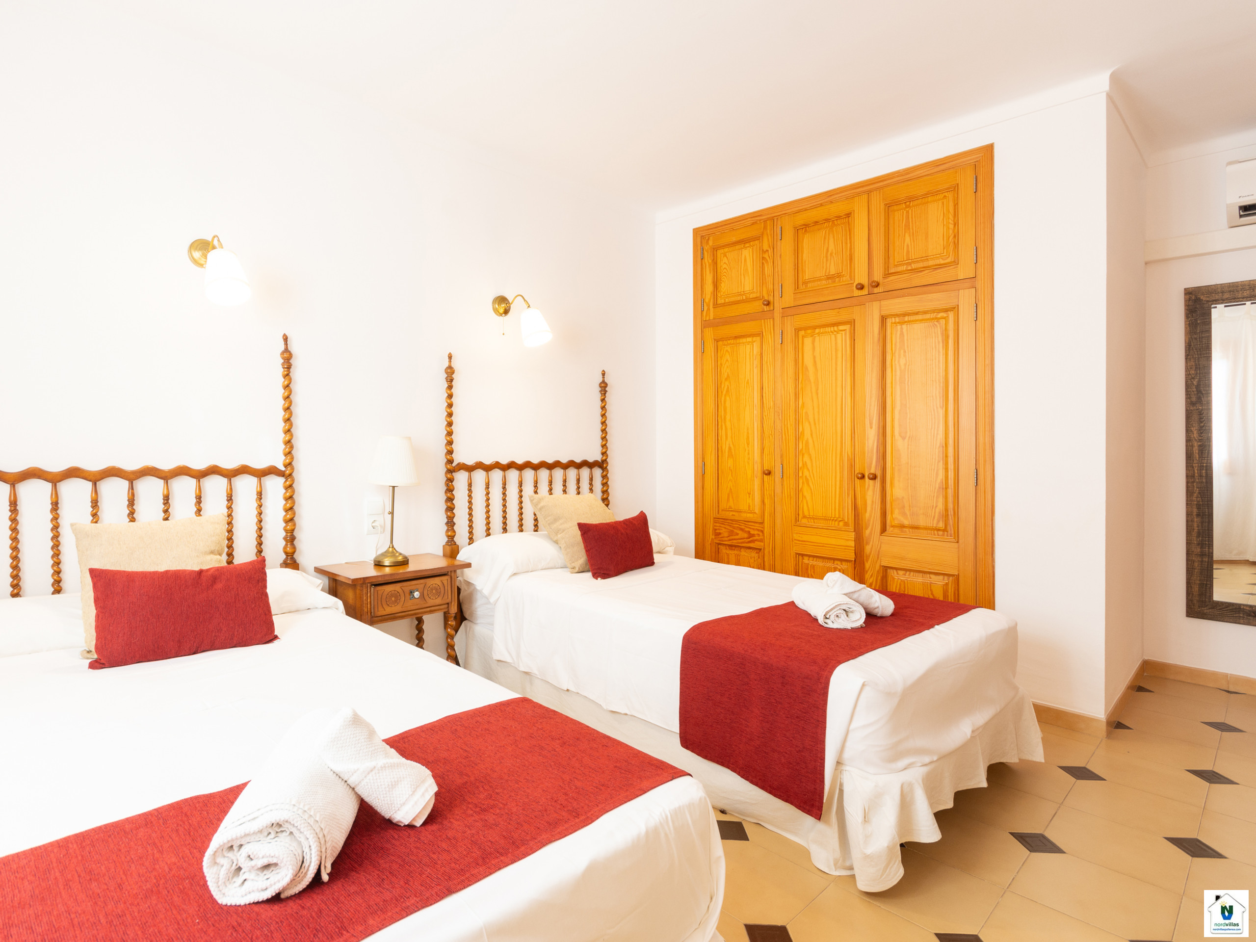Die Villa verfügt über 4 Schlafzimmer: zwei mit Einzelbetten und zwei mit Doppelbetten, eines davon mit einem eigenen Badezimmer. Ein zweites Badezimmer, ebenfalls mit Dusche, bedient den Rest des Hauses. Für Familien mit Kindern sind Kinderbett und Hochstuhl auf Anfrage verfügbar.