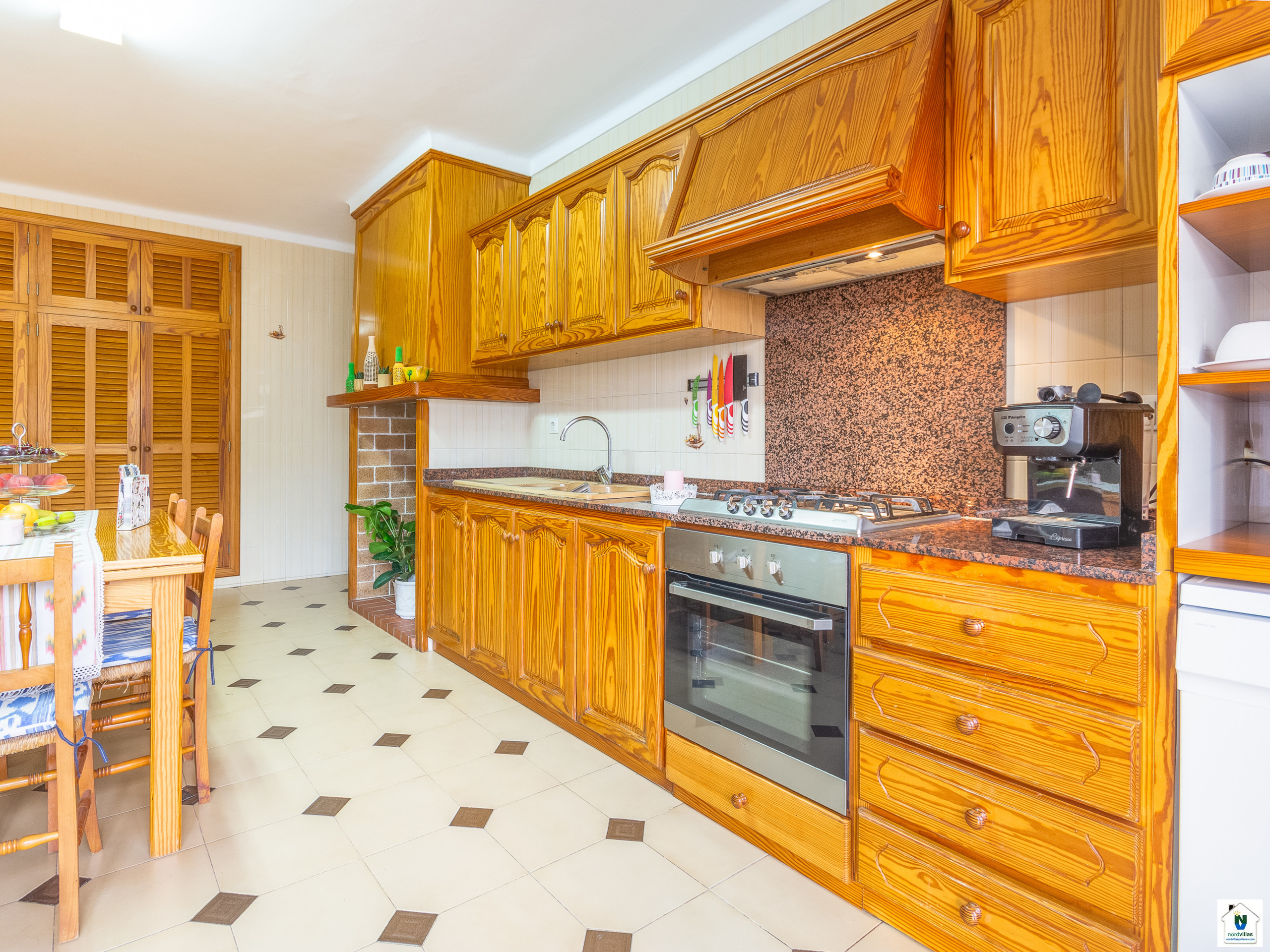 Das Innere der Villa ist geräumig und modern, mit einem lichtdurchfluteten Wohn-Esszimmer, das perfekt für Familien- oder Freundestreffen ist. Ausgestattet mit Satelliten-TV, CD-Player und Klimaanlage in allen Räumen bietet diese Villa das ganze Jahr über ein komfortables Ambiente. Die Gasküche ist komplett ausgestattet, sodass Sie köstliche Mahlzeiten zubereiten können, und das Haus verfügt auch über eine separate Waschküche mit Waschmaschine, Bügelbrett und Bügeleisen.
