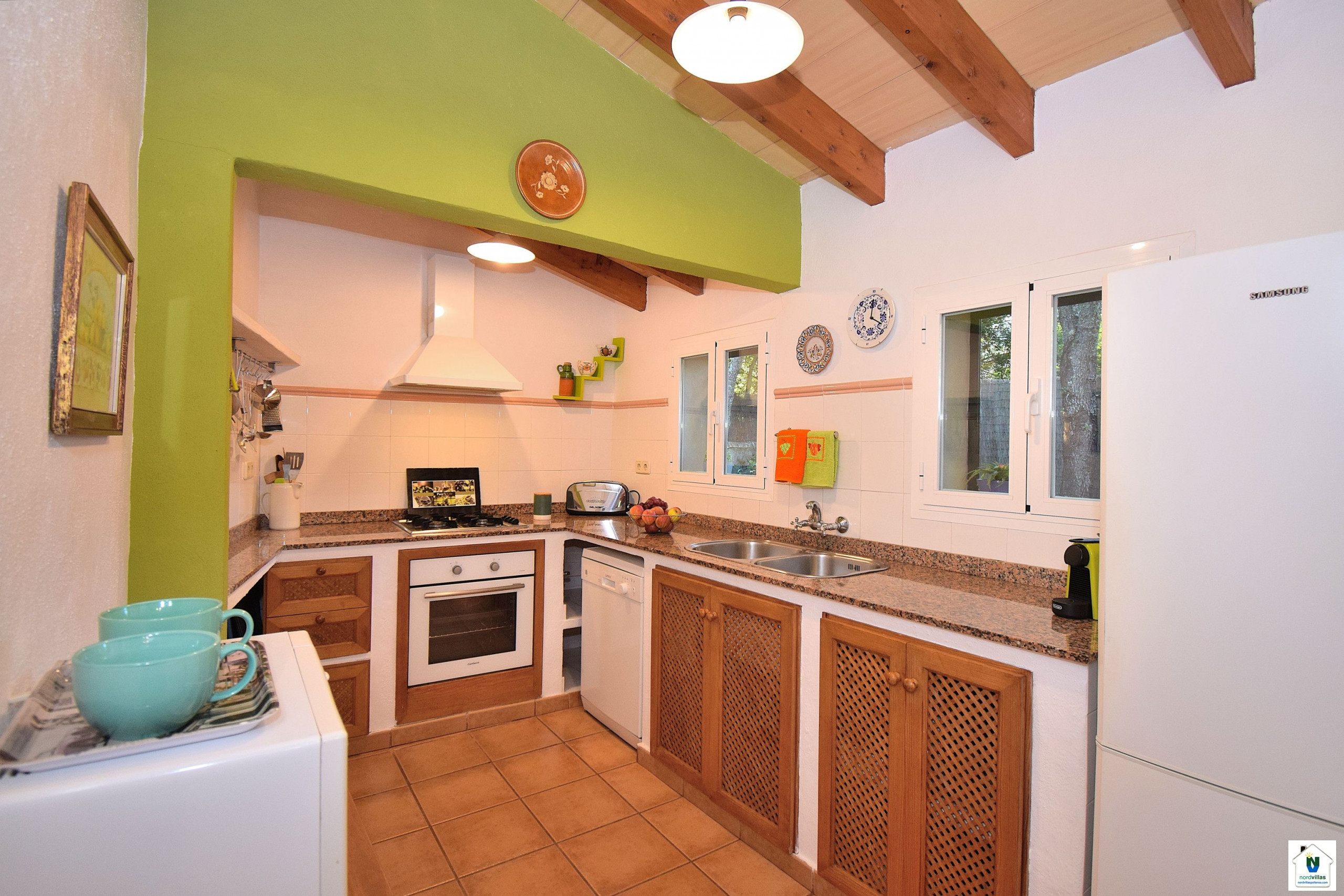 Al entrar en la casa se entra en el confortable salón-comedor con televisión por satélite, reproductor de DVD y, por supuesto, Internet/WLan. Por la noche puede relajarse frente a la chimenea. Justo al lado se encuentra la cocina totalmente equipada, donde se pueden preparar deliciosos platos mediterráneos.
