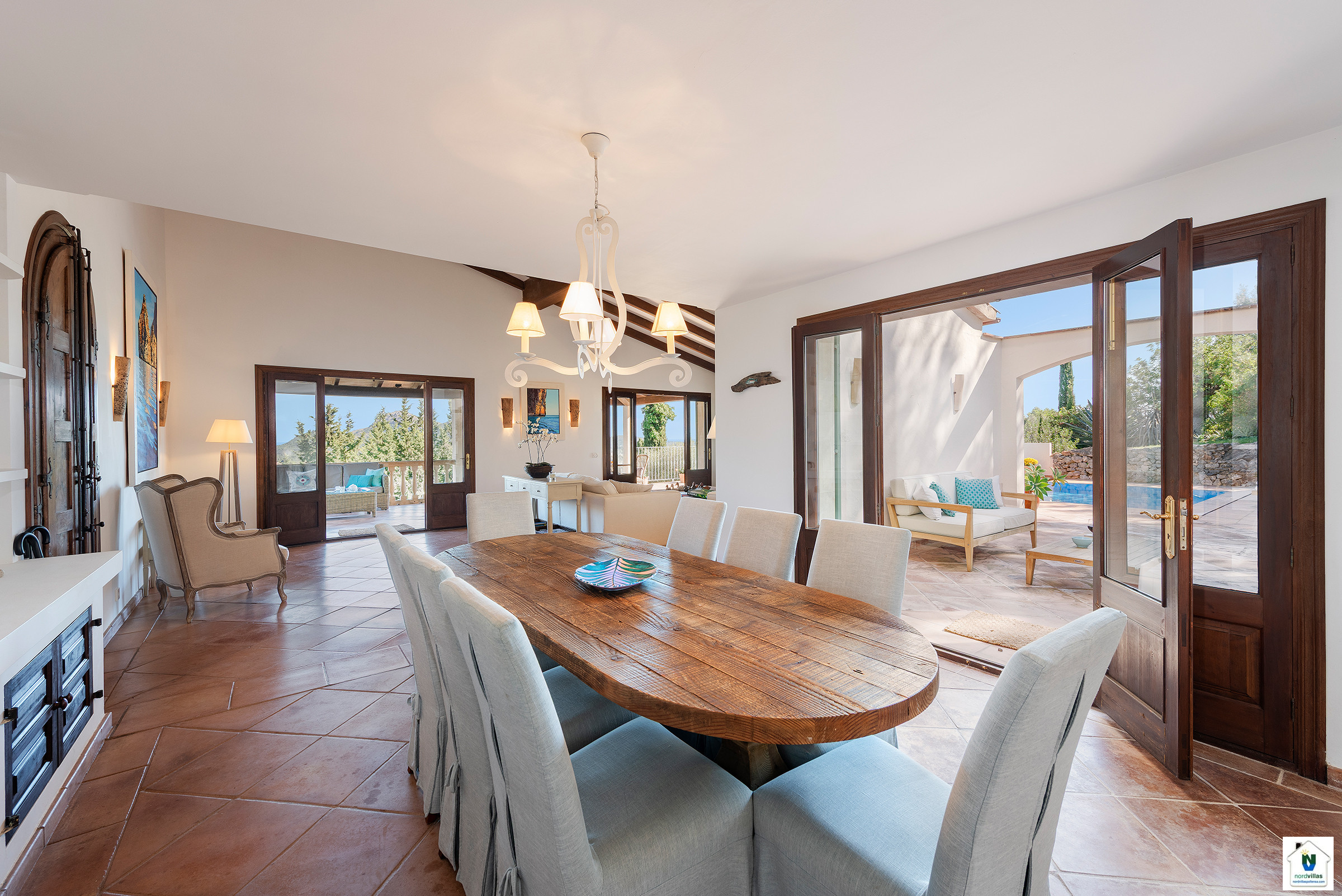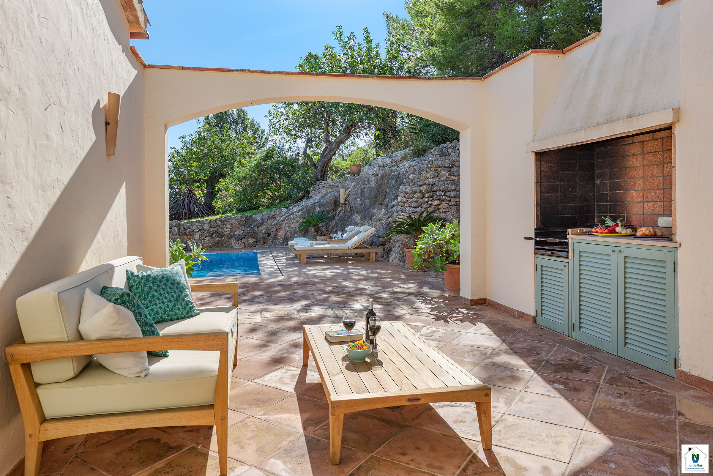 En el exterior, la propiedad ofrece una gran terraza con zona de chill-out, espacio para tomar el sol en cómodas tumbonas junto a la piscina privada, y una zona de barbacoa perfecta para disfrutar del clima mediterráneo durante todo el año.