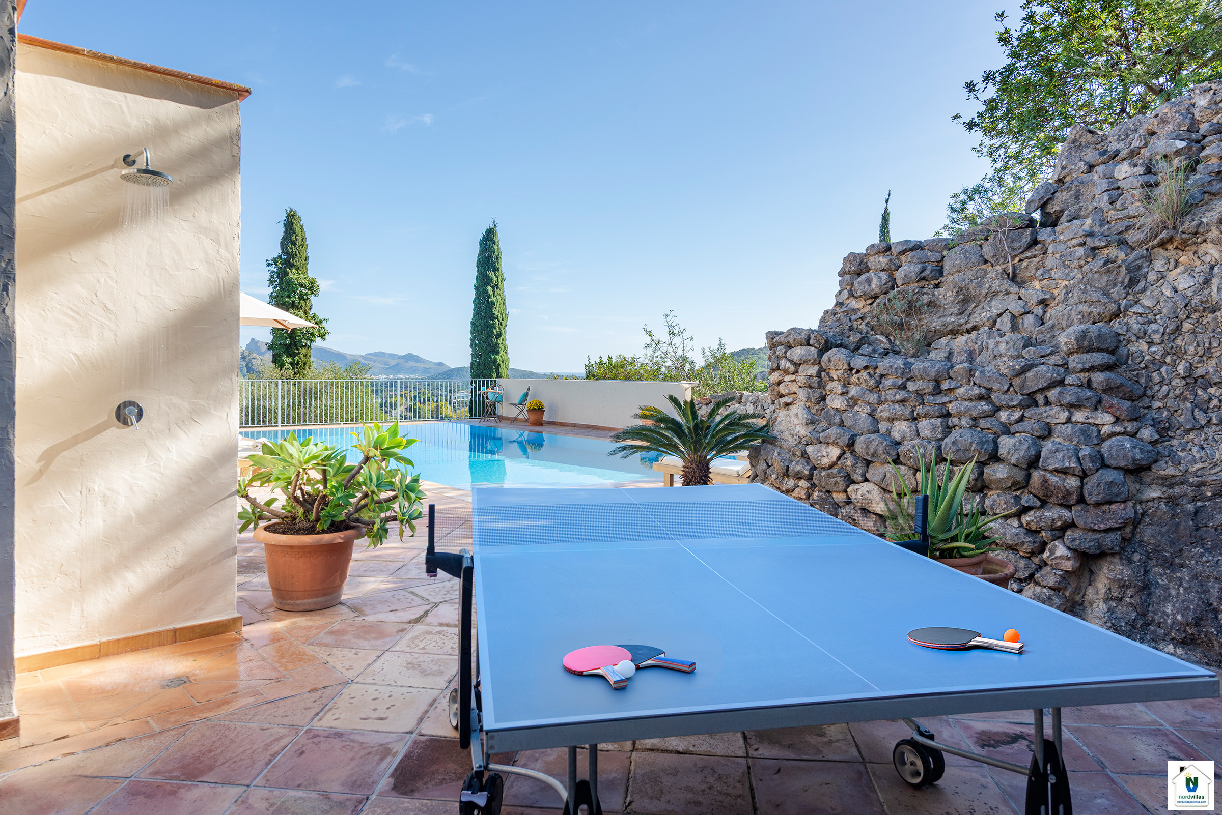 Utenfor tilbyr eiendommen en stor terrasse med en avslappingsområde, plass for solbading i komfortable solsenger ved den private bassenget, og et grillområde perfekt for å nyte det middelhavske klimaet hele året rundt.
