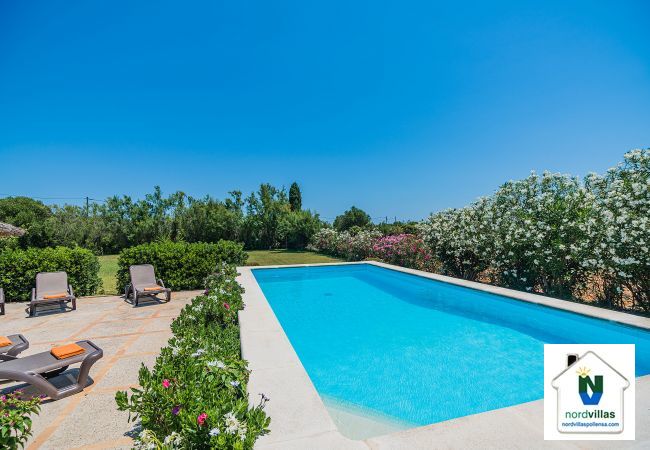 Private country house with private driveway for up to 7 guests in the countryside surrounding Pollensa only 5 minutes drive to the Port Pollensa with its golden beaches, restaurants, bars and shops and 10 minutes to Old Town Pollensa with its charming square and café culture. Traditionally furnished with terracotta tiles and beamed ceilings. Fully fitted kitchen with microwave, dishwasher, coffee machine, kettle, etc. 1 double bedroom with aircon, 1 twin bedroom with air con and 1 twin bedroom and 1 single bedroom on the mezzanine level with fans only. 2 bathrooms with shower and toilet. Covered porch area outside for al fresco dining and relaxing. A built in barbecue. Parking on the property for up to 3 cars. Private pool 8x4 m, depth 1.95x1.00m – pool towels are provided in this house. Terraced area for sunbathing on the sunloungers which are provided. Attractive lawned garden with mature shrubs olive, palm and fig trees.