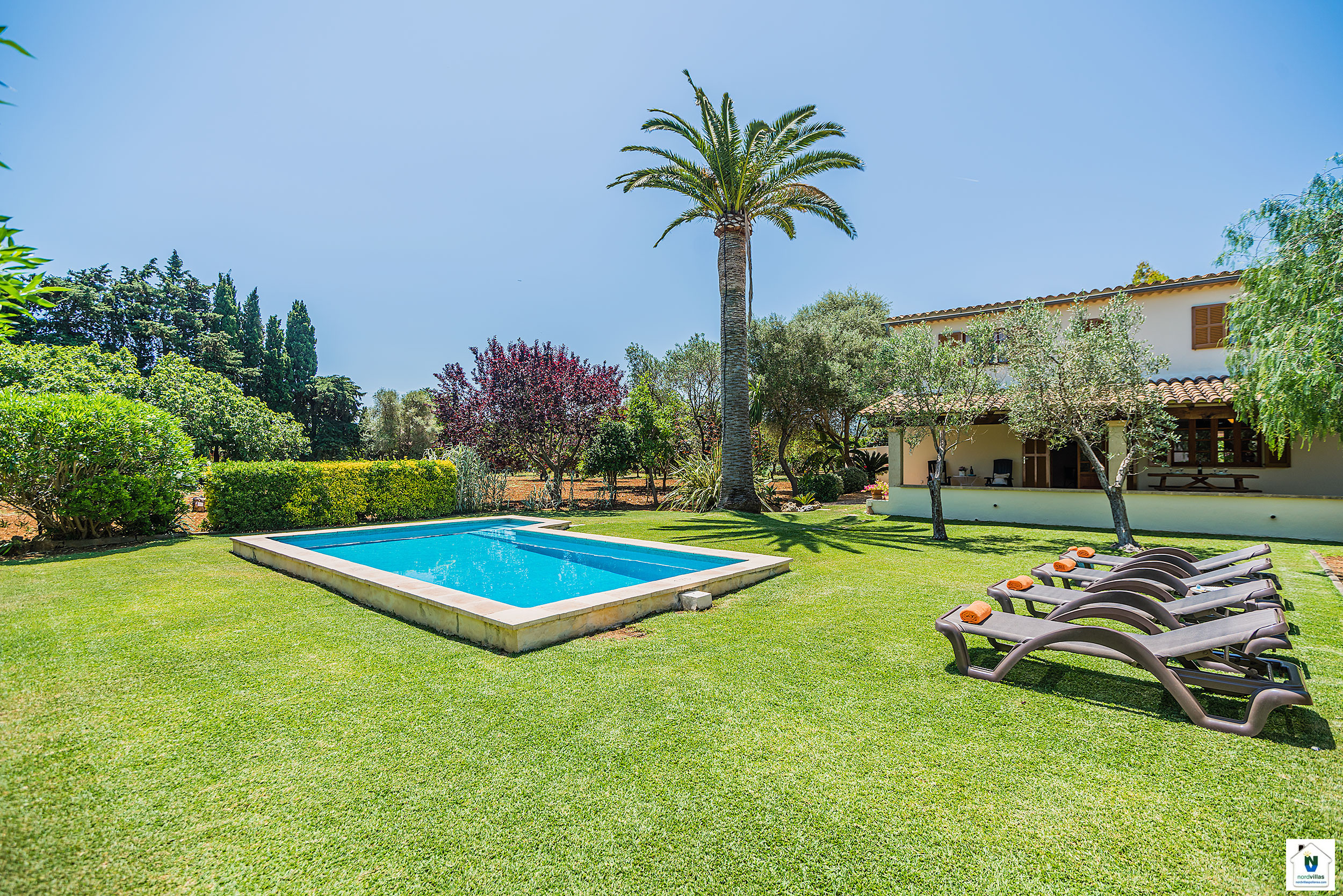 Das Haus hat eine absolut ruhige, nur durch schmale Fahrwege erreichbare Lage im Hinterland von Pollensa. Das ganze Anwesen wird von Gärtnerhand sehr gepflegt. Der Garten ist blumenreich angelegt, der private Pool neben einer großen Palme lädt zur Entspannung ein. Liegen stehen auf der grünen Wiese bereit. Die Ausstattung des Hauses ist ländlich rustikal. Im Obergeschoss befinden sich zwei komfortable klimatisierte Schlafzimmer. Es besteht außerdem überall die Möglichkeit der Querlüftung. Alle Fenster besitzen stabile Fensterläden. Die Küche hat eine umfassende Geräteausstattung, Geschirr und Gläser sind in großer Zahl verfügbar, große Esstische gibt es im Haus wie auf der Terrasse. Die gute Betreuung durch NordVillas beginnt bereits vor der Reise und ist während des Aufenthalts sehr diskret.
