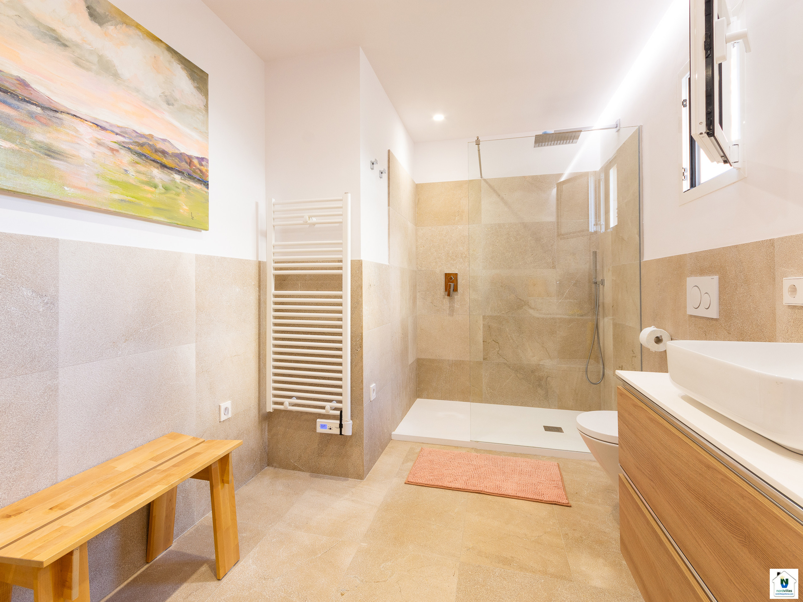 The villa has 4 bedrooms: two with single beds and two with double beds, one of them with an en-suite bathroom. A second bathroom, also with a shower, serves the rest of the property. For families with children, a cot and high chair are available upon request.